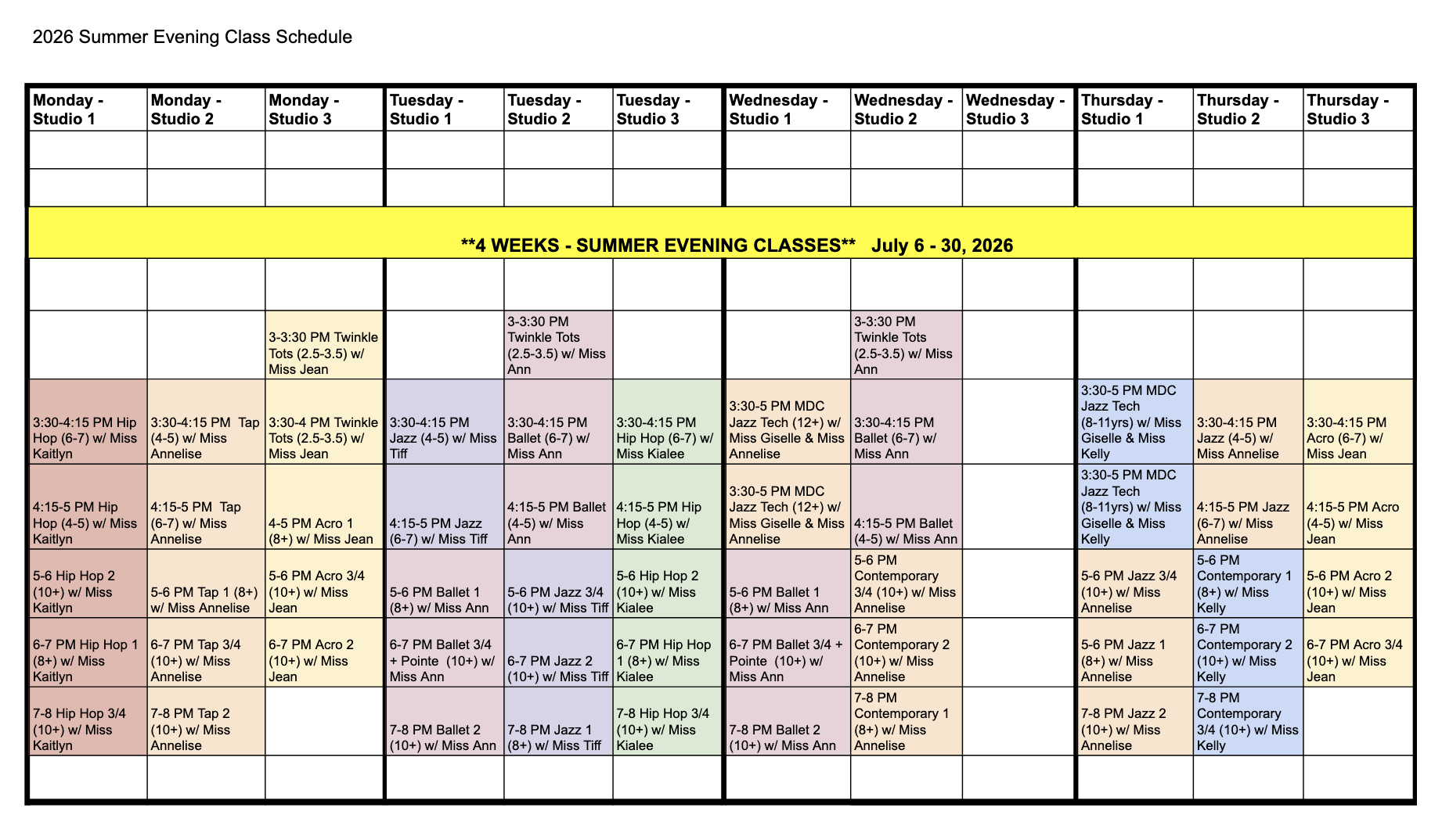 Summer Class Tuition will be charged on Monday, July 6, via Auto Pay. *Tuition is the same for Summer Session (4 weeks) as 1 month of regular classes during the school year. (Ex. 1 hour/week for 4 weeks = $65 total for summer). See Tuition Page for additional pricing details.