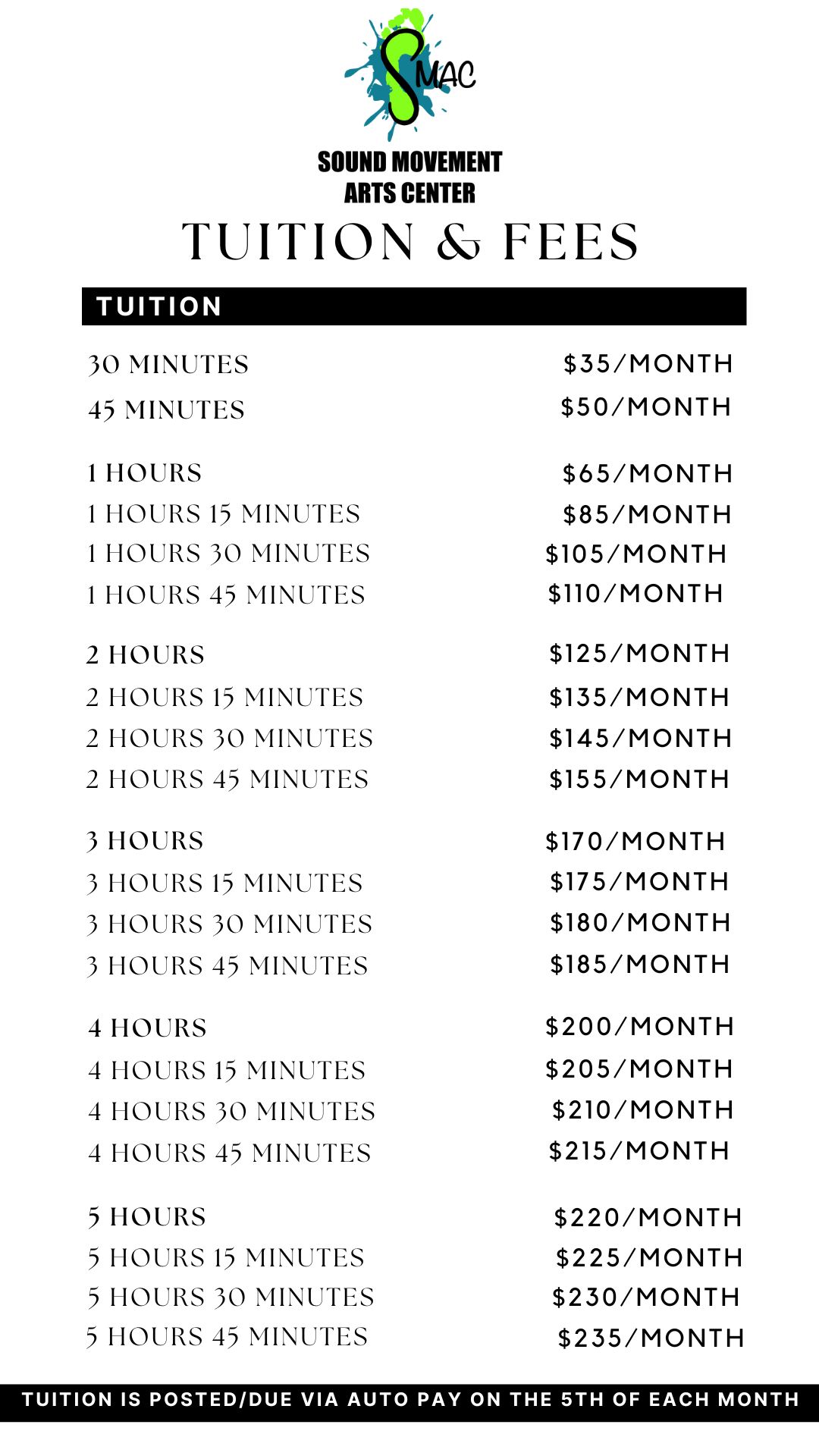 TUITION will be posted/due on the 5th of each month (starting in September). *$65 (per dancer) Annual Registration Fee is due upon enrollment in classes. A $15 late fee will be automatically assessed on the 15th of the month, for accounts that remain unpaid.