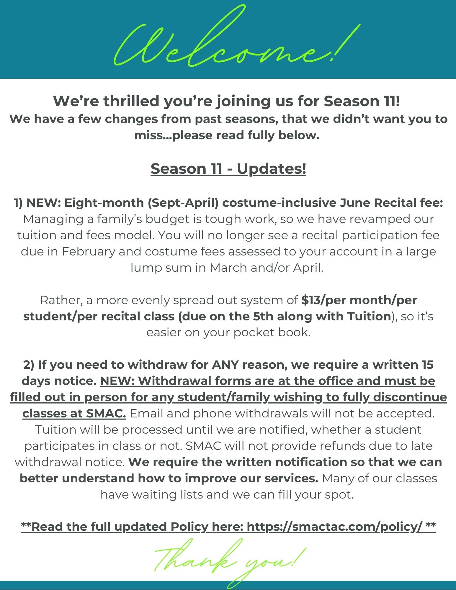 We’ve updated our Tuition and Policy Pages for Season 11.